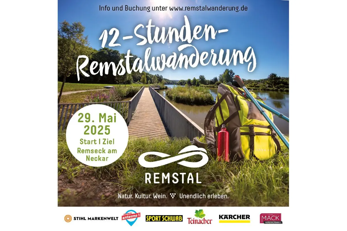 Am 29. Mai 2025 findet wieder die beliebte 12-Stunden-Wanderung durch das Remstal statt. Dieses Jahr führt die von Remstal Tourismus e.V. erarbeitete Strecke über ca. 47 km und ca. 660 Höhenmeter von Remseck am Neckar über Bittenfeld, Weiler zum Stein, Hertmannsweiler, Winnenden, Korb und Waiblingen wieder zurück nach Remseck am Neckar.
